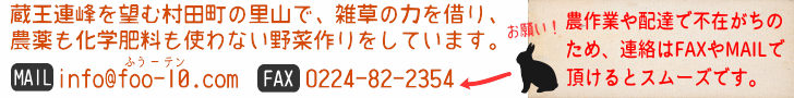 自然農場 風天は、宮城県仙台市のすぐ南、柴田郡村田町にある農場です。化学農薬・化学肥料は使わず、堆肥と雑草の力で野菜を育てています。一般的には有機栽培・オーガニックと言われる育て方で、野菜の多くは「固定種」や「在来種」。